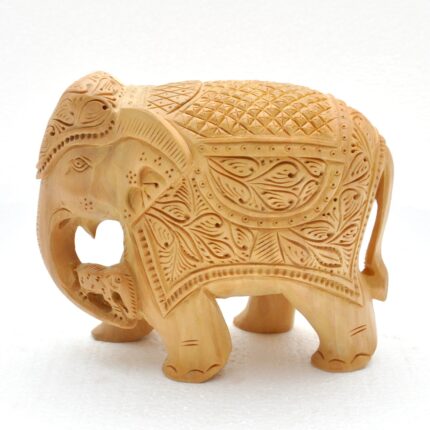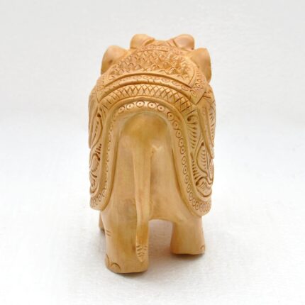 Each elephant is carefully carved from quality wood and hand-painted in warm golden, green, and red tones. The decorative patterns feature delicate floral motifs, lattice designs, and ornamental accents that reflect classic Rajasthani artistry. The raised trunk, traditionally considered a symbol of good luck and positivity, adds cultural significance to the piece.